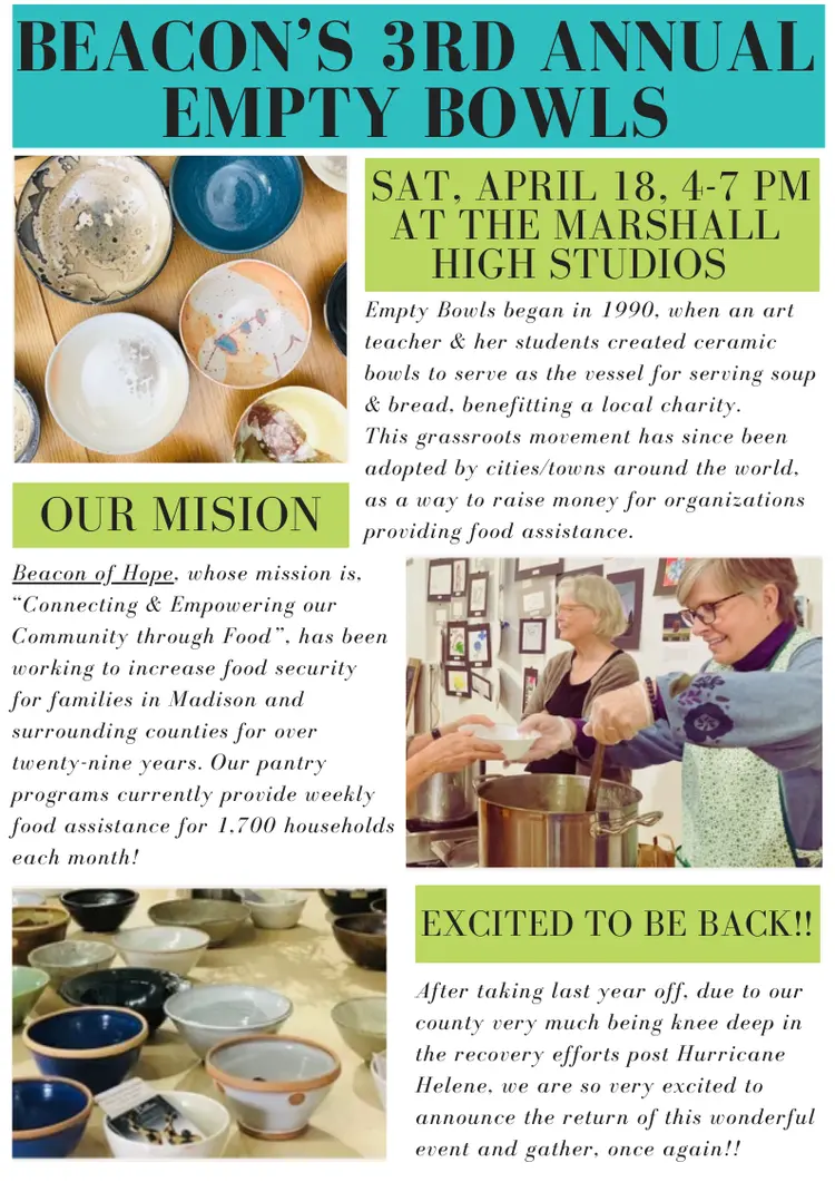 On April 18, 2026, Beacon of Hope offers its Empty Bowls fundraiser at Marshall High Studios in Madison, returning this year after a hiatus due to Hurricane Helene.